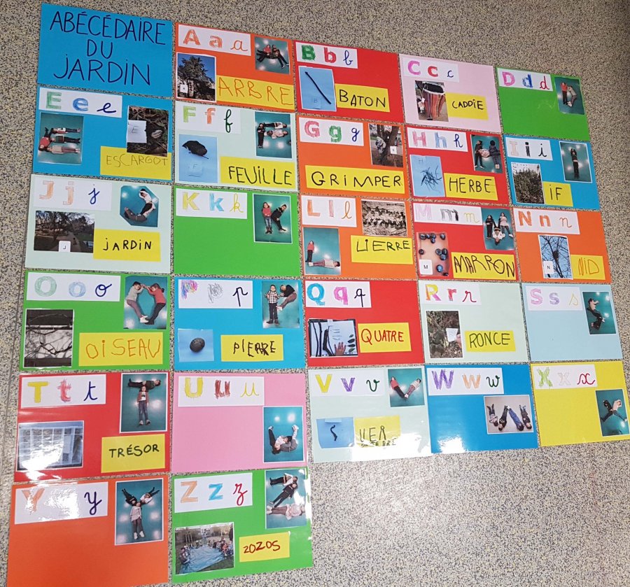 9. En classe entière, production de l'affichage collectif: retrouver chaque graphie, chaque objet du jardin, chaque lettre-formée-avec le corps pour les associer sur une page; puis mettre chaque page dans l'ordre de l'alphabet.